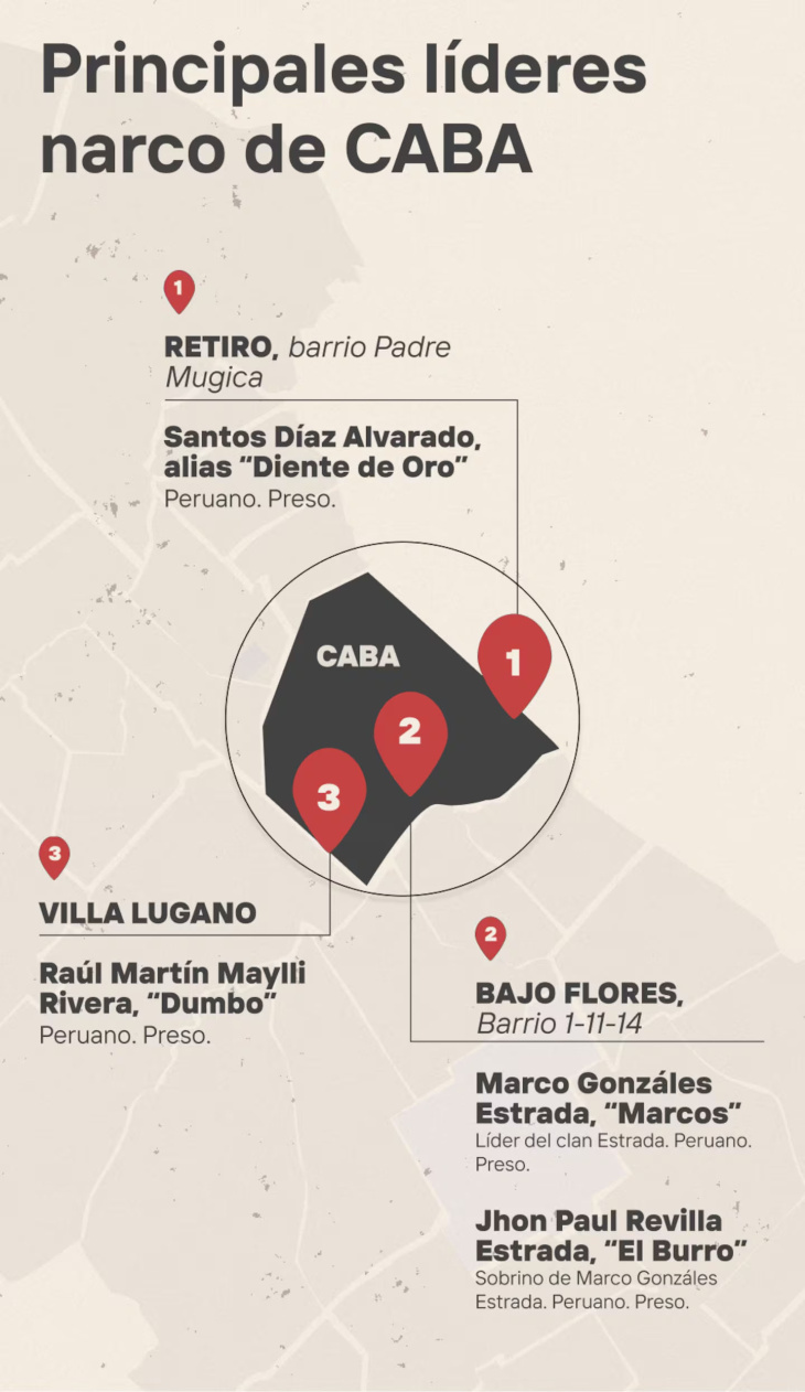 En CABA, la cara más visible del problema son los búnkeres de narcomenudeo que se multiplican en zonas vulnerables. La Villa 21-24 y Zavaleta de Barracas, la 31 (o barrio Mugica) de Retiro, Bajo Flores, Villa Lugano, Constitución y Chacarita son algunos de los puntos donde operan grupos liderados por narcos de origen peruano, boliviano o paraguayo.