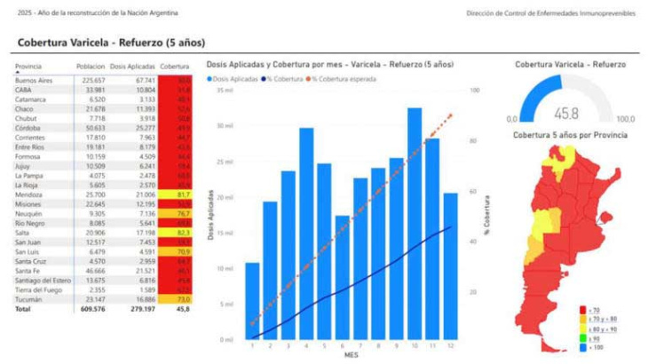 De acuerdo con el informe, el refuerzo contra la varicela de los 5 años solo se administró al 45,8% de las infancias. Las jurisdicciones donde menos se aplicó fueron la provincia de Buenos Aires y la Ciudad de Buenos Aires, donde apenas se vacunó el 30% y el 31% de la población objetivo, respectivamente.