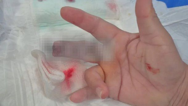 Medios locales difundieron además una foto del estado en el que quedó la mano de la enfermera tras el violento ataque. En la imagen se observa la mano derecha de la trabajadora de la salud apoyada sobre una superficie esterilizada con gasas y varias manchas de sangre visibles. CONTENIDO SENSIBLE.