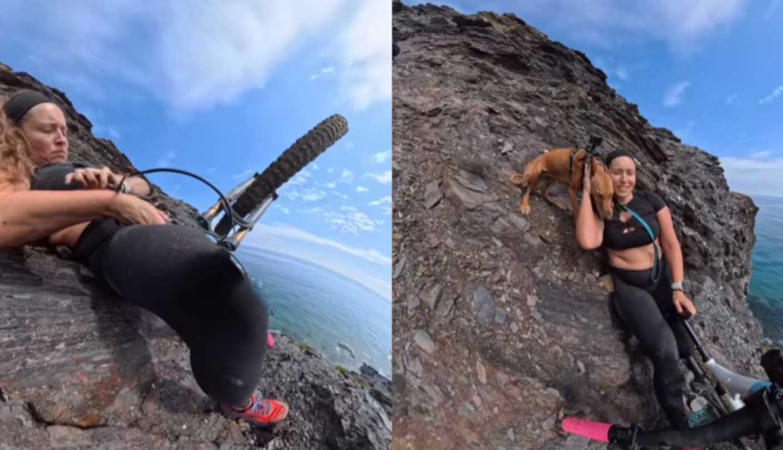 En las imágenes se puede ver cómo la ciclista circulaba por un camino estrecho cercano a un acantilado junto con su perra. En cuestión de segundos, la rueda de la bicicleta perdió estabilidad y la mujer se acercó peligrosamente al borde del precipicio.