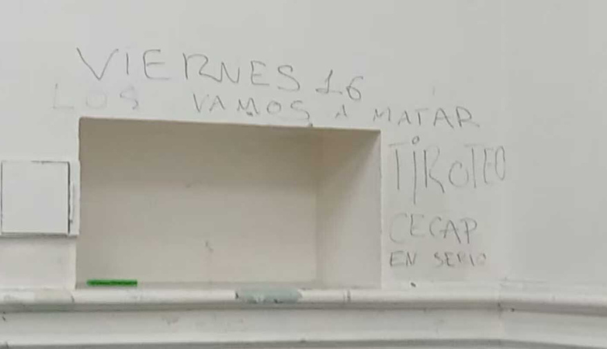La foto de la pared pintada en el edificio de Recoleta enseguida circuló en redes: “Viernes 16 los vamos a matar, tiroteo CECAP en serio”, dice escrito con lapicera negra.