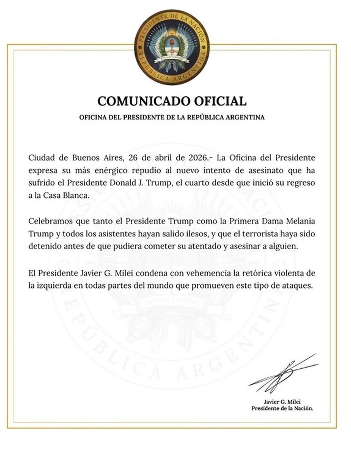 El Gobierno de Javier Milei condenó el tiroteo ocurrido en el hotel Washington Hilton, en Estados Unidos, durante una cena de periodistas a la que asistía el presidente Donald Trump, quien fue evacuado y resultó ileso tras el episodio.