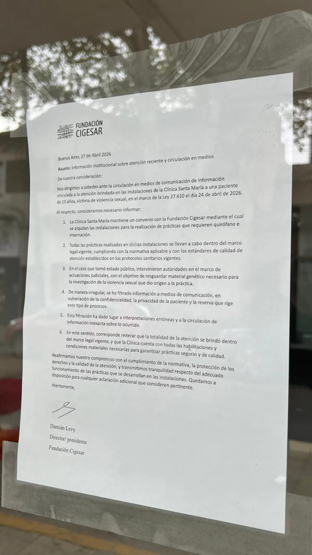 La Fundación CIGESAR emitió un comunicado oficial luego del allanamiento realizado en la Clínica Santa María de Villa Ballester, donde la Policía halló ocho fetos. La organización confirmó que intervino en el aborto practicado a una niña de 12 años, víctima de violación, y sostuvo que el procedimiento se realizó en cumplimiento de la legislación vigente.
