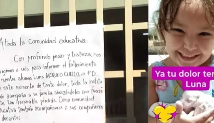 “Con profundo pesar y tristeza, nos dirigimos a ustedes para informar el fallecimiento de nuestra alumna Luna Miqueo Cuello, de 1° grado D. En este momento de dolor, toda la institución acompaña a su familia”, señalaron desde la escuela.